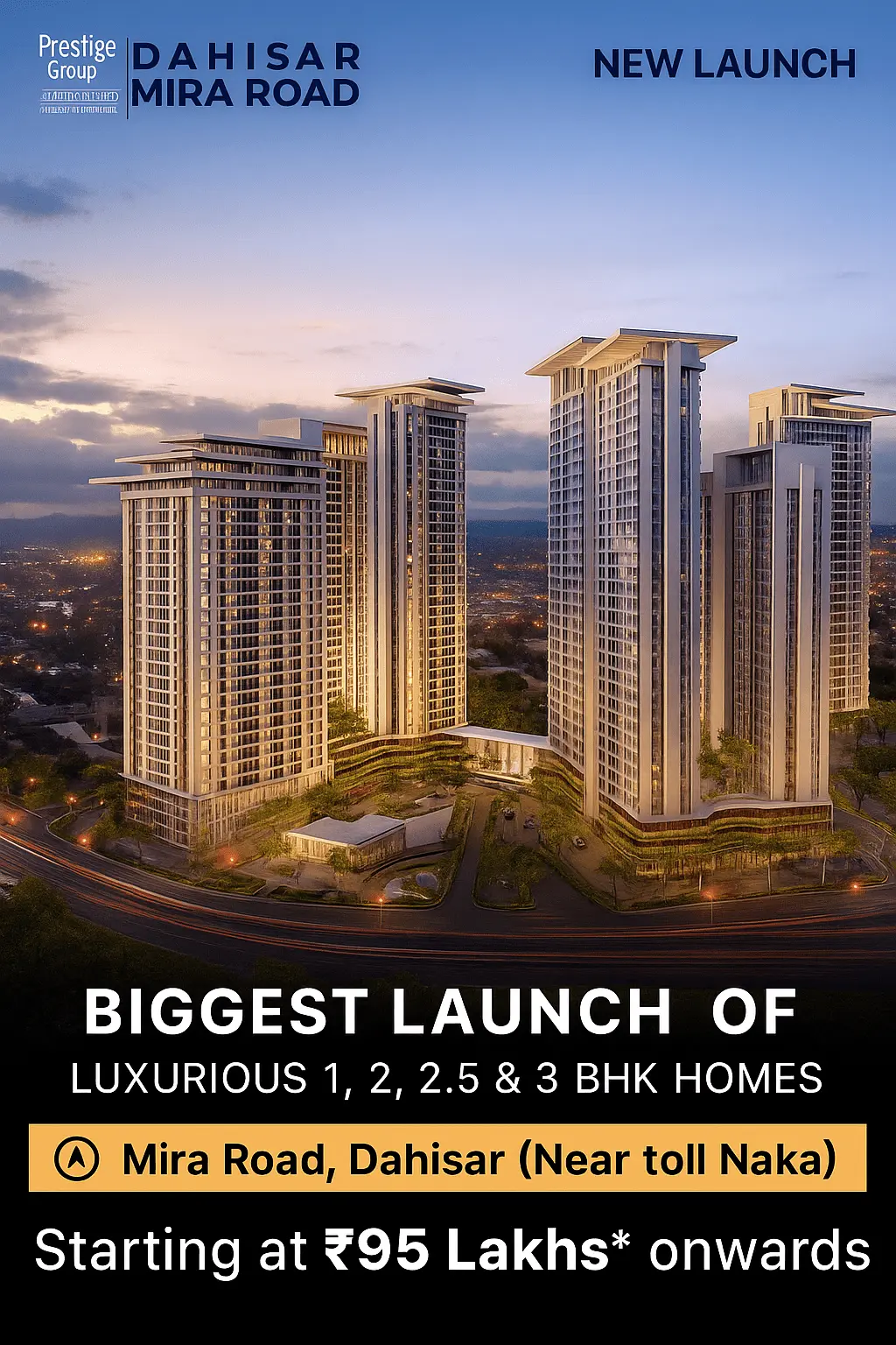 Prestige Mira Road (also known as Prestige City Mira Road) is a flagship luxury residential project by Prestige Group, located near Mahajan Wadi, Mira Road East, Mumbai. The township is spread across 5 acres and will have 5 premium high-rise towers (G+3P+35 floors), offering a modern blend of elegant living, top-tier amenities, and strategic connectivity to key parts of Mumbai.