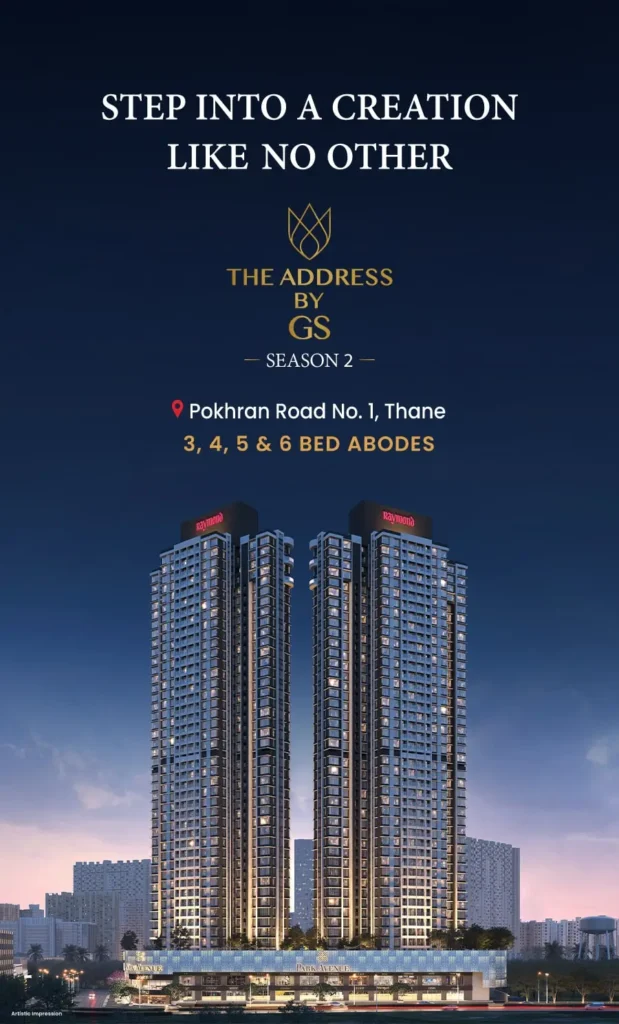 The Address by GS sits on roughly 3 acres with primarily 2 towers of about G+3P+51/52 storeys, developed as part of Raymond’s larger Pokhran Road land parcel. It targets upper‑mid and luxury buyers, with high carpet areas and relatively low density compared to the overall land bank.